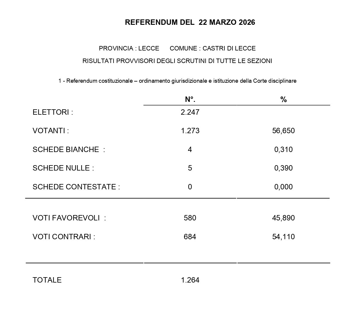 Risultati del Referendum del 22 e 23 marzo 2026 a Castri di Lecce